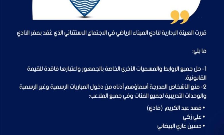 قررت الهيئة الإدارية لنادي الميناء الرياضي في الاجتماع الاستثنائي الذي عُقد بمقر النادي ما يلي: