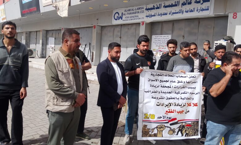 يرصد جانبا من الإضراب الذي قام به تجار وموردي البضائع في المحافظة على اثر قرار مجلس الوزراء برفع التعرفة الجمركية وتكدس الاف الحاويات في موانئ
