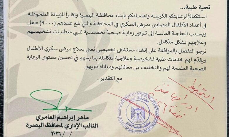 وبيّن الكتاب أن عدد الأطفال المصابين بمرض السكري في البصرة بلغ نحو 9000 طفل، الأمر الذي يتطلب توفير رعاية صحية تخصصية تلبي احتياجاتهم في التشخيص والعلاج.